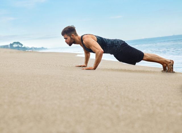 If you’re trying to get into shape, performing resistance training is a must. And for those of you who aren’t too keen on working out indoors at a gym, doing bodyweight movements at the beach can be a great way to build muscle. So the next time you’re at the beach, here are some ultra-effective exercises to build muscle that you can add to your routine. Check them out below, and next, be sure to read The 6 Best Exercises for Strong and Toned Arms in 2022, Trainer Says.