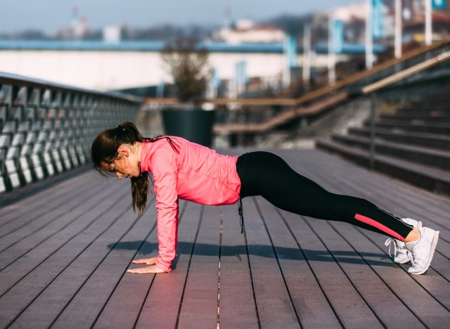 “Get into a high plank position on a mat with your arms straight out and shoulders, elbows, and wrists stacked. Your shoulders, hips, and ankles should be in line,” explains Meier. “From here, jump your feet outward and land with them wider than shoulder-width, as if you were doing a standard jumping jack. Then, jump your feet back in and repeat, keeping your core tight and hips and spine neutral throughout the move.”