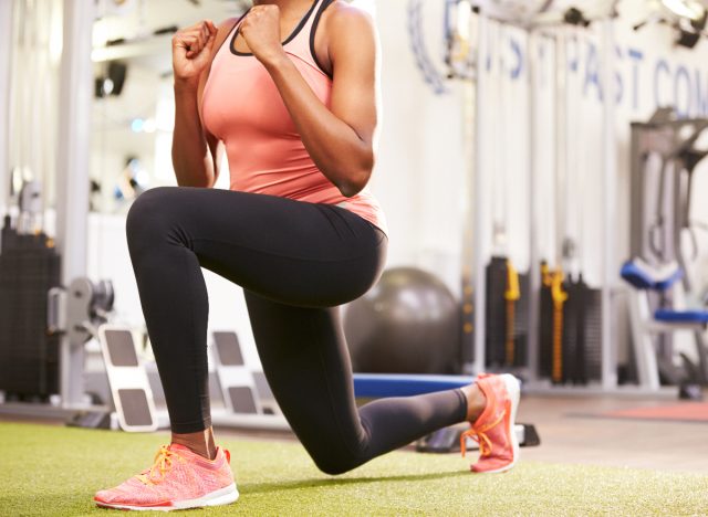 For this exercise, Vesco instructs, “Step back with your left leg as the right knee comes over the right toes, and take a slight hinge in the spine while you lunge—use the left leg to propel you forward to stand, and go directly into the other side.”