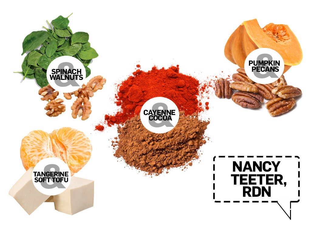 If this sounds like an unlikely pairing to you, just imagine them blended up with a frozen banana, some peanut butter and a splash of almond milk. You won’t even taste the leafy greens. Omega-3 fatty acids in walnuts help boost absorption of vitamin K found in spinach, according to Teeter. Vitamin K is a triple threat that helps with cell growth, blood circulation, and keeps the bones strong.