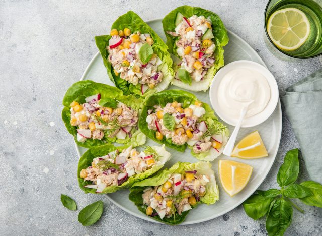 Tuna is rich in Omega-3 fats, an essential fat that provides heart health benefits. It also requires minimal preparation, making it great for easy meals. Swap the raisins in this dish for any dried fruit of choice. Just make sure to skip options that have added sugar. Use a double layer of lettuce for each cup to boost fiber for very few calories.