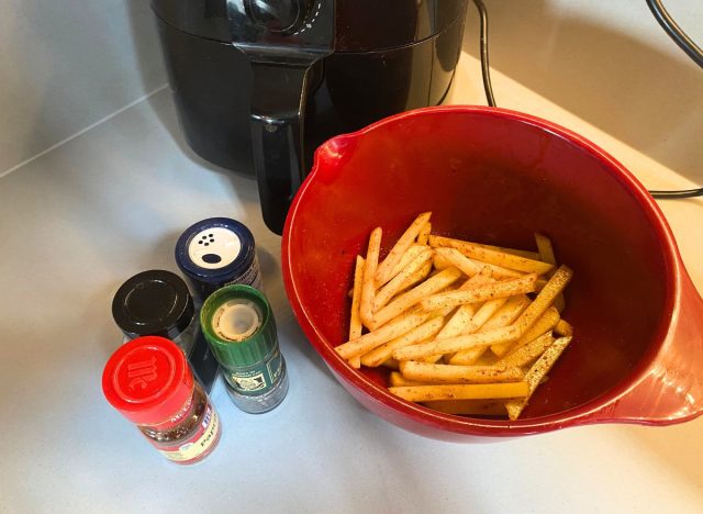 - Arrange the fries: Spread the seasoned potato strips in a single layer in the air fryer basket. Avoid overcrowding to ensure even cooking. Depending on the size of your air fryer, you might need to cook in batches.