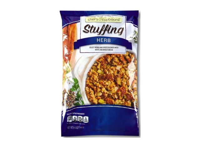 This is a more classic stuffing, flavored with traditional herbs like thyme, garlic powder, onion powder, and rosemary. The Aldi brand is a bargain buy, but it also gets the job done. One food reviewer was pleasantly surprised by the instant stuffing mix. “[It] had a decent flavor that wasn’t too salty…The stuffing also turned out to be moist but firm,” the blogger Wizzley wrote. The convenience of this Thanksgiving side comes out to $0.99 per 6-ounce box or $2.29 for a 14-ounce bag.