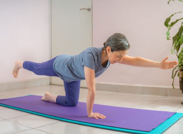 When it comes to preserving your bone density and muscle mass, strength training is a must, as both your bones and muscles decrease as you age. “A solid anti-aging workout includes at least two days a week of strength training—and you can do even more if you split your routine to focus on different parts of the body each day. For a two-day-a-week routine, do exercises from head to toe using selectorized machines, cables, or free weights—whatever you’re most comfortable with,” Dr. Bohl recommends.