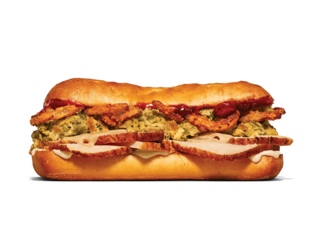Just in time for the holidays, Arby’s new Deep Fried Turkey Gobbler Sandwich Meal is a big hit right now. Each sandwich contains a quarter pound of thick-sliced Deep Fried Turkey piled high with crispy onions, Swiss cheese, stuffing, cranberry spread & mayo on a toasted sub bun.