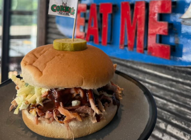 Corky’s BBQ has lots of cheaper options on the menu where fans can enjoy BBQ without sacrificing taste or quality. The Pork Shoulder Sandwich served on a toasted bun and topped with Corky’s BBQ sauce and coleslaw ($6.99 for the regular, $9.49 for the jumbo) and the option to upgrade to a combo (fries and a drink) for $4.99 more. There’s also a Beef Brisket Sandwich ($6.99) or the Pulled Chicken Sandwich ($6.99).