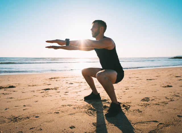 If you’re trying to get into shape, performing resistance training is a must. And for those of you who aren’t too keen on working out indoors at a gym, doing bodyweight movements at the beach can be a great way to build muscle. So the next time you’re at the beach, here are some ultra-effective exercises to build muscle that you can add to your routine. Check them out below, and next, be sure to read The 6 Best Exercises for Strong and Toned Arms in 2022, Trainer Says.