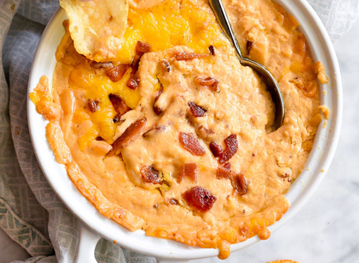 Beer cheese is a classic pub food made mainly of cream cheese, cheddar cheese, and beer. This version adds bacon—because why not? Serve it hot and bubbly with potato chips.