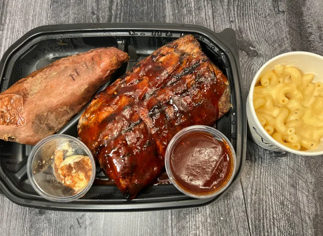I visited Longhorn Steakhouse to try one of their rib dinners. It came with a massive sweet potato with cinnamon sugar butter, a big side of mac & cheese, and a huge slab of ribs coated in barbecue sauce with a side of extra barbecue for dipping.