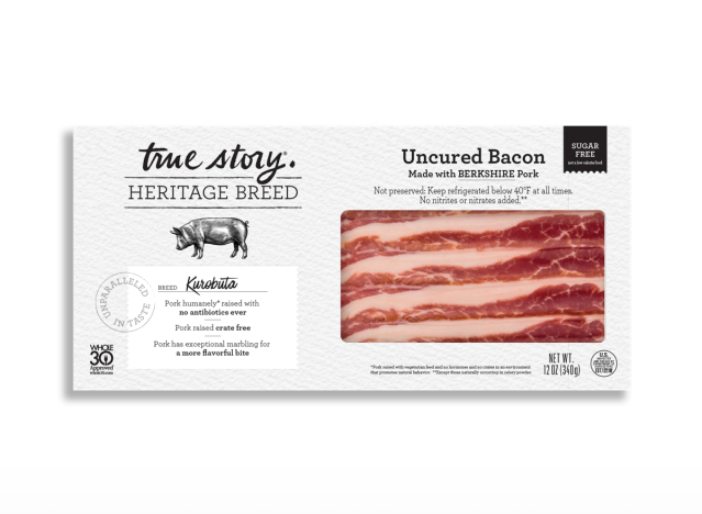 True Story Kurobuta Uncured Bacon is a delicious sugar-free option made from heirloom breed pork. “This special pork is known for its marbling and rich pink hue. Subtly seasoned and thickly sliced, this sugar-free bacon is the most delicious we’ve ever had,” the brand says.
