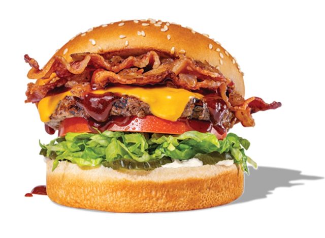 Red Robin is famous for over-the-top bacon cheeseburgers piled high with toppings and bottomless fries. They take the Bacon Cheeseburger seriously, maintaining it “is loaded” with taste. “We start with a hot and juicy beef patty on a fluffy bun, add crispy hardwood-smoked bacon, lettuce, tomato and mayo as well as your choice of cheese. Don’t take this decision lightly – the cheese is what really makes this burger yours. You can go classic with American or Cheddar, add a little kick with Pepper Jack or opt for the savory flavor of Swiss. Or you can take that left turn at Albuquerque and go with something completely different but just as tasty: tangy Bleu Cheese crumbles.”
