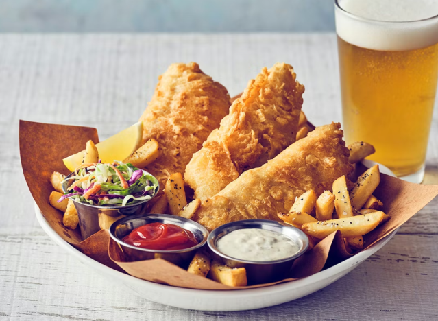 TGI Fridays has a Fish & Chips plate made with beer-battered golden cod fillets served with seasoned fries, coleslaw, and tartar sauce. Diners should check their local restaurant for special deals and offers, as they might be different depending on location.