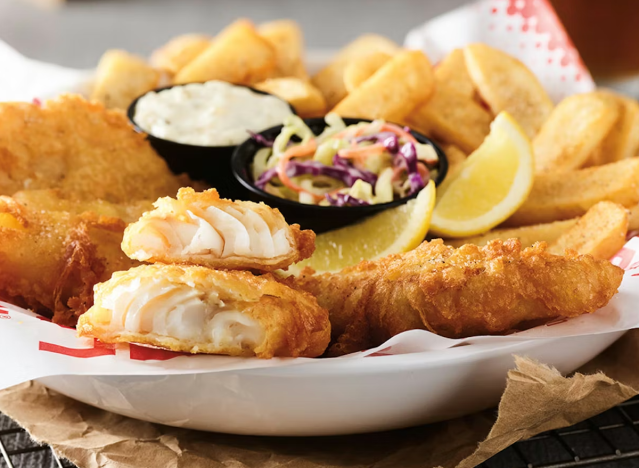 Bennigan’s has delicious cod and fries, made in a traditional pub-style. The Finn’s Beer-Battered Fish & Chips is made with tender cod loins hand-crafted in a delicious beer batter, lightly fried to crispy and golden brown. This fish is served with Homestyle French Fries, kicked-up coleslaw and jalapeño tartar sauce.