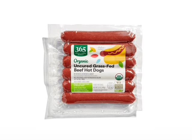 365 by Whole Foods Market Organic Uncured Grass-Fed Beef Hot Dogs are the real deal: Made with 100% real beef and absolutely delicious. “One of the best hot dogs I’ve tasted. It’s more of a Jumbo too,” one happy Amazon shopper shared.