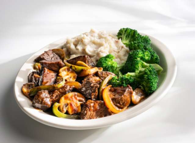 The Beef Tips & Mash at Friendly’s comes with chunks of meat smothered in sautéed peppers, mushrooms, and onions, and is topped with smoked gravy. “I ordered the steak tips with mashed potatoes and broccoli, and everything was spot-on. The steak was juicy and flavorful, the mashed potatoes were buttery and smooth, and the broccoli was fresh and perfectly cooked,” a reviewer said.