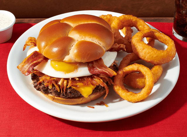 Denny’s Slamburger is made with crispy hash browns, an egg made your way, Applewood-smoked bacon, and American cheese stacked high on a golden brioche bun. “I was pleasantly surprised by the hashbrowns, the bottom bun fell apart…but everything went together so well. Good s**t, especially high. Fries were good too!” one person writes on Reddit.