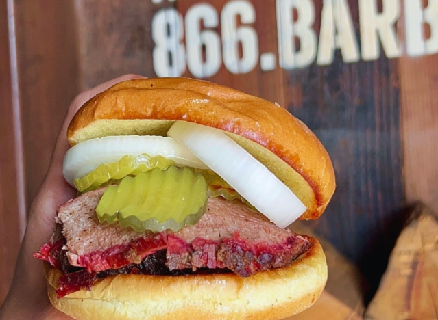 With 866 locations across 44 states, Dickey’s Barbecue Pit is one of the biggest barbecue restaurants in the world. They serve “solid” BBQ meats, according to a Redditor. “Very good, my wife and I go to smokehouses all over the USA. Certainly, for the offerings you will get here. It’s pretty good.” The brisket is considered an upcharge meat since it is so divine, and you can order it on any sandwich. The coleslaw is a popular side, and you can add it to your sammy.