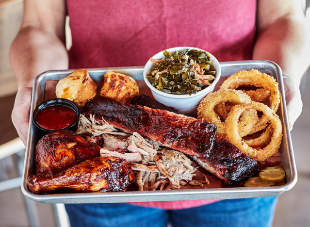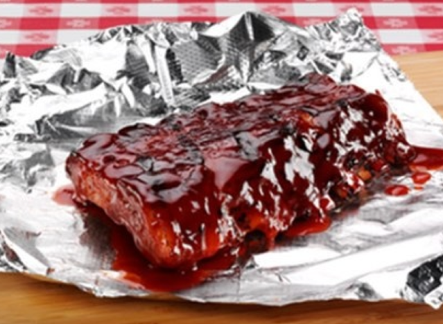 Portillo’s is known for next-level hot dogs and Polish sausage, but the chain also has excellent ribs on the menu. The Full Slab of Ribs Dinner is made from ribs smothered in a homemade sweet BBQ sauce, served with fries or onion rings and a side garden salad.