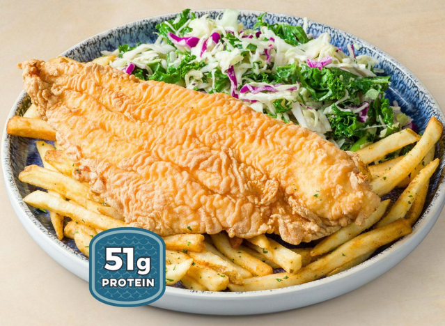 California Fish Grill has a beautiful Fried Catfish plate that contains a whopping 51 g of protein. “A favorite in the South, this white fish is mild and flaky, and is great grilled or fried,” the chain says, adding that guests can choose two sides including their proprietary “Kaleslaw”. Other sides include beans, fire roasted street corn, and much more.