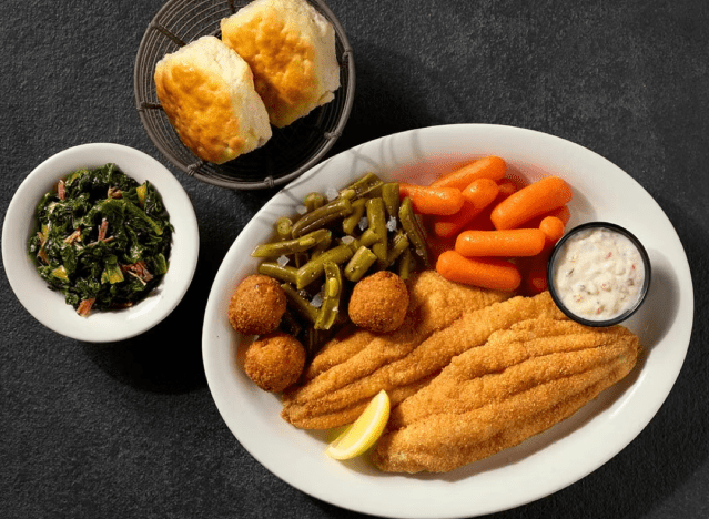The Fried Catfish plate at Cracker Barrel is a fan-favorite meal, made with two cornmeal-fried U.S. farm-raised catfish fillets served with tartar sauce and hushpuppies. Guests can choose two or three classic sides, including coleslaw, and buttermilk biscuits or corn muffins. Fried catfish is also available on the breakfast menu.