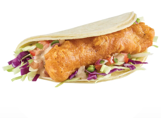 Del Taco is giving the people what they want this season not only with the classic, year-round fish tacos but with the jumbo shrimp burrito options too. The Beer Battered Fish Tacos are 3 for $7 right now, and frequently top the list of best fast-food tacos, period. These tacos contain beer-battered wild-caught Alaska Pollock fillets topped with crunchy shredded cabbage, savory secret sauce, pico de gallo, wrapped in a warm corn tortilla, and served with a fresh-cut lime wedge.