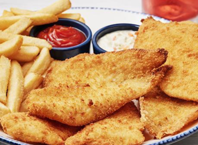 The Wild-Caught Crunch-Fried Flounder plate at Red Lobster is a popular option served with tartar sauce and the choice of side like crispy French fries. The chain also has a traditional Fish & Chips made from beer-battered cod, served with flavorful Chesapeake fries, plus coleslaw and hush puppies.
