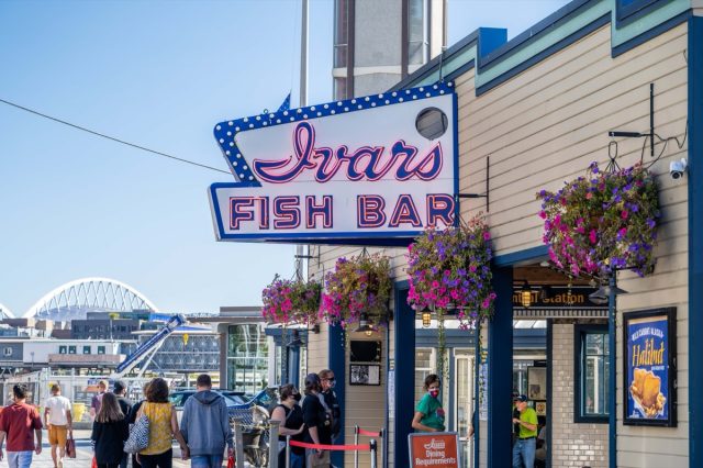 Ivar’s has a whopping Full Boat 10pc Special on the menu, containing 10 piece True Cod, Fries, Coleslaw and a Bowl of Chowder. “Best fast food experience I’ve ever had. Everything came out crispy and perfectly fried. Staff was super nice too,” one diner said.