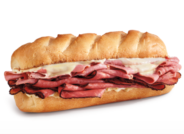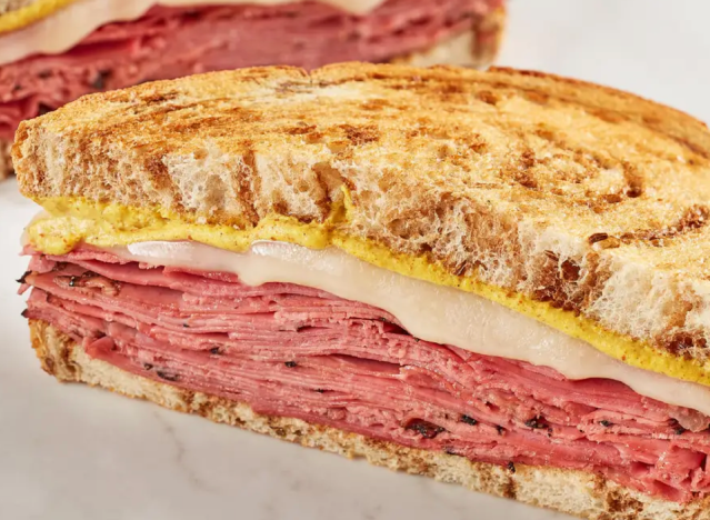 Jason’s Deli has a Reuben The Great sandwich featuring a 1/2-pound of hot corned beef or pastrami, Swiss cheese, sauerkraut, and 1000 Island on marbled rye. There’s also the New York Yankee, which is even meatier with a 3/4-pound of pastrami. “The pastrami Reuben is excellent, big portion of a not too salty pastrami, good kraut, and adding some spicy mustard to the 1000 Island dressing is a great choice,” one diner shared.