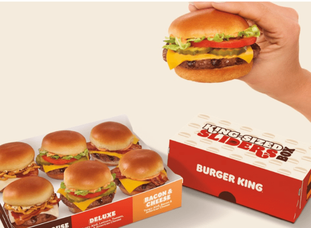 BK is hopping on the slider wagon, testing out King Size Sliders Box in April and May in Portland, OR, and Columbus, OH. The “bold, snackable burgers” come in three versions, a “Deluxe Slider,” featuring a 100% flame-grilled beef patty, topped with fresh lettuce, tomato, pickles, and tangy burger aioli, all on a soft and buttery slider bun, the “Steakhouse Bacon Slider,” featuring a 100% flame-grilled beef patty, topped with melty Swiss cheese, crispy bacon, crispy onions and peppercorn sauce, all on a soft and buttery slider bun, and a “Bacon & Cheese Slider,” with 100% flame-grilled beef patty, topped with crispy bacon, melty American cheese and tangy burger aioli, on a soft and buttery slider bun. They are “more interesting to me than a plain cheeseburger slider, but I think they should be cheaper,” a Redditor says about the new item, adding that “Size wise, they seem slightly larger than what I think of as a slider but not by much. The toppings were pretty generous though.”