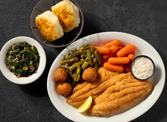 Popular at breakfast, lunch, and dinner, Cracker Barrel‘s catfish options are a huge hit with diners. The Fried Catfish plate is made with two cornmeal-fried U.S. farm-raised catfish fillets, served with tartar sauce, hushpuppies, two classic sides, and buttermilk biscuits or corn muffins. The Grilled Catfish plate is ideal for those who want a lighter option.