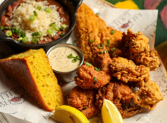 Red Fish Grill is known for excellent grilled fish options, but the fried items are always worth ordering. The Fried Gulf Seafood Platter contains crispy fried catfish, Gulf shrimp & oysters, red beans & rice, cornbread, and ravigote sauce. The Louisian Gulf Shrimp Po-Boy is another crispy delight.