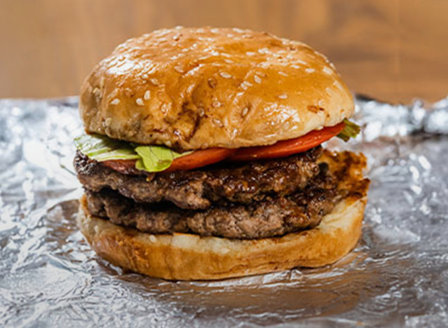 Five Guys burgers are made with “quintessential” smash patties, per Hageman, flat with no pink and a crisped perimeter. “They are a bit greasy but not bad, and they delight with an almost homemade taste.” Hand-smashed on the grill, you can load them up with fresh toppings, including sauce, cheese, tomato, and pickles.