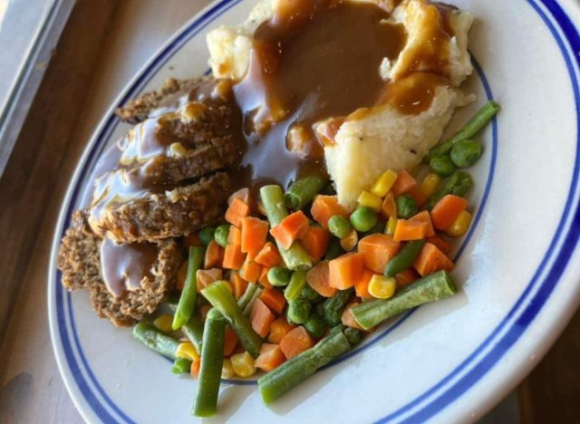 Marie Callender’s traditional, oven-baked comfort food is so popular that it is available in the freezer section of your local grocery store. Pot pies, roasted turkey dinner, and Marie’s Meatloaf are some of the trademark meals that people have been eating for decades. “Slow-baked with 100% ground Angus beef, onions, green peppers, carrots and special seasonings and topped with mushroom cabernet gravy. Served with mashed potatoes and fresh seasonal vegetables,” reads the menu about the meatloaf.