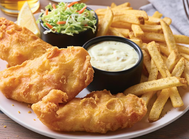 The Hand-Battered Fish & Chips plate at Applebee’s is made with golden, crispy battered fish fillets, coleslaw, fries, tartar sauce and a lemon wedge. Diners can opt for the waffle fries instead for a slight upcharge, for a savory alternative to the regular fries. Want even more crunch? Go for the Onion Rings (or why not both?).