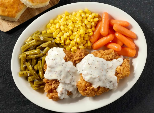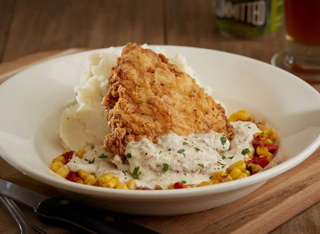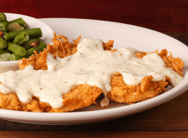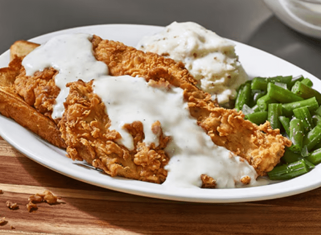 Cracker Barrel serves homestyle fried chicken smothered in gravy, which diners keep coming back for. It is “very good,” one writes on Reddit, adding that the poultry pieces are “light, flavorful and juicy.” Another adds, “I was pleasantly surprised at how delicious it was. And the honey drizzled on it knocked it out of the park.” My location used to have chicken fried chicken on the menu, but it was recently removed.