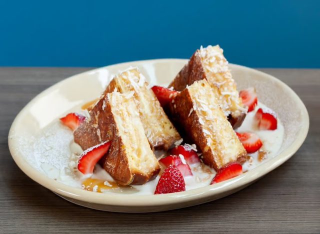 Depending on the location and season, IHOP offers stuffed French toast in various flavors and they’re not to be missed. “IHOP is a classic for a reason,” says Chef Shorne. “Their stuffed French toast features thick-cut bread filled with sweet cream cheese, often paired with strawberry, banana, or lemon ricotta toppings. It’s rich, nostalgic, and widely available across the U.S.”