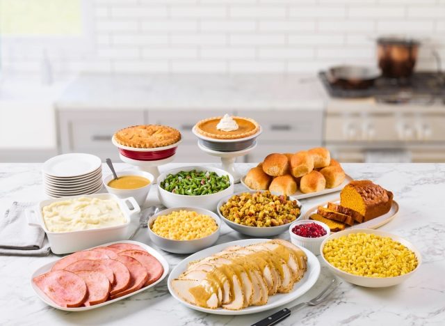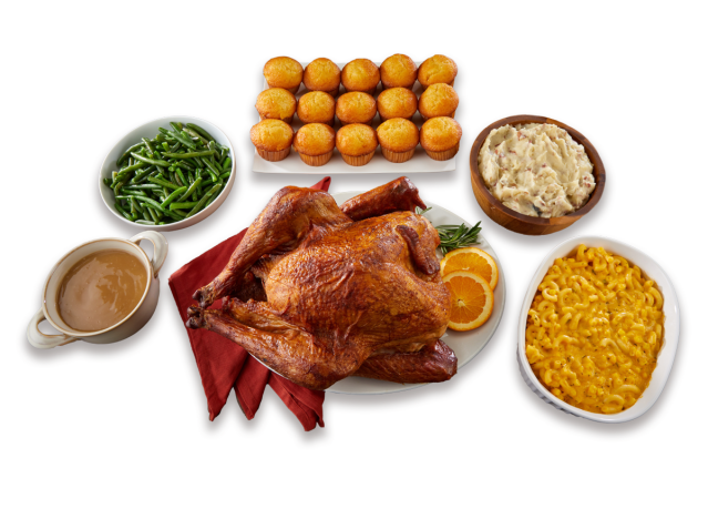 Famous Dave’s Whole Hickory Smoked Turkey Feast includes a Whole Hickory Smoked Turkey, 3 Quarts Garlic Red Skin Mashed Potatoes, 3 Quarts Dave’s Cheesy Mac & Cheese, 3 Quarts Green Beans, and 15 Corn Bread Muffins. Don’t sleep on the Double Smoked Ham either!