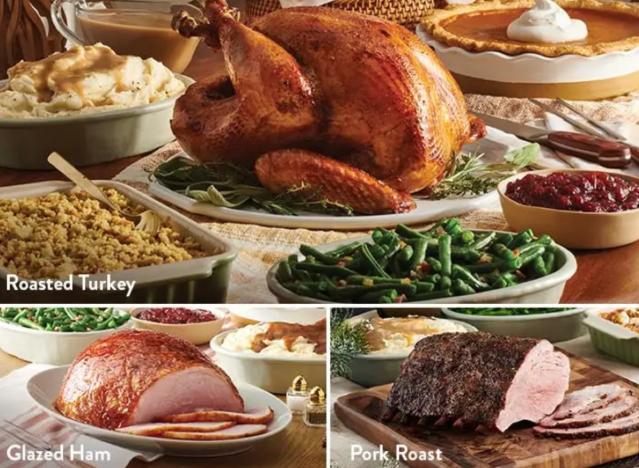 Bob Evans has you covered this Christmas: The Premium Celebration Platter contains slow-roasted turkey, hickory-smoked ham, house-made bread & celery dressing, cranberry relish, mashed potatoes & gravy, green beans & ham, buttered corn, freshly baked dinner rolls and a slice of pumpkin pie.