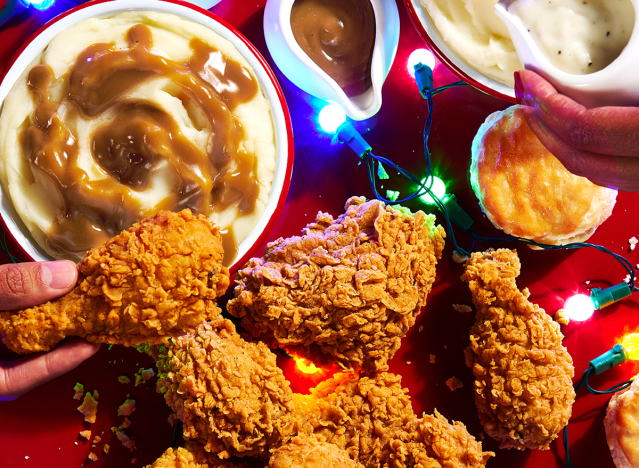 KFC is encouraging diners to skip the turkey and enjoy fried chicken during the holidays (which apparently is a thing in Japan!). For just $25, the Extra Crispy Festive Feast contains 8 pieces of fried chicken, mashed potatoes, biscuits, and a gravy flight featuring classic, white peppercorn, and brand-new southwest cheddar gravy. “It’s everything you love about the holidays, but without the dry bird or sink full of dishes,” the chain promises. Sold!