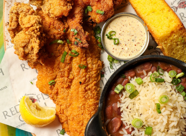 Red Fish Grill has plenty of delicious crispy fried options on the menu, including crispy cornmeal catfish. The Fried Gulf Seafood Platter is made with crispy fried catfish, Gulf shrimp & oysters, red beans & rice, cornbread, and ravigote sauce. The restaurant also has a Wood Grilled Redfish with Crawfish, served with brabant potatoes, Cajun tasso-onion butter, pea shoots, and lemon-butter sauce.