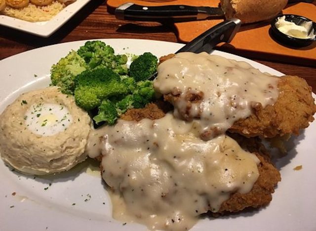 Texas Roadhouse Country Fried Sirloin, hand-battered, fresh-cut sirloin fried until crispy and golden, then topped with a made-from-scratch cream gravy, is large and delicious. “Texas Roadhouse chicken fried steak is miles better than CB, as far as chains go,” one Redditor says. “This is a good one, I’ve had it and it’s pretty nice,” adds another.