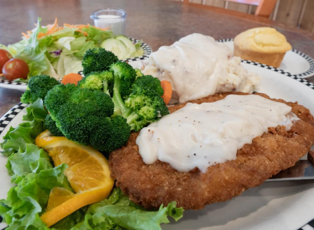 Golden Corral offers a lot of food and many choices at a great value. Their buffet features a chicken-fried steak on certain days, and Buchanan says it’s a must-try. “Golden Corral’s country-fried steak stands out because people can build the plate exactly how they like it,” she explains. “Adding extra gravy and pairing it with familiar Southern sides is a big part of why it stays popular. It’s an easy comfort-food option for people who want variety on one plate.”