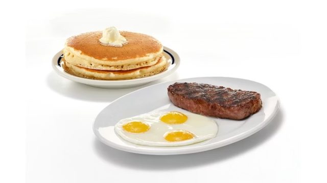 The T-Bone Steak & Eggs plate at IHOP is $17.29 for a generously portioned meal. This platter includes one T-Bone steak grilled & served with 3 eggs your way and 3 fluffy buttermilk pancakes. There’s also a Sirloin Steak Tips & Eggs plate for $15.99, served with grilled onions, mushrooms, 2 eggs your way, hash browns, and pancakes.