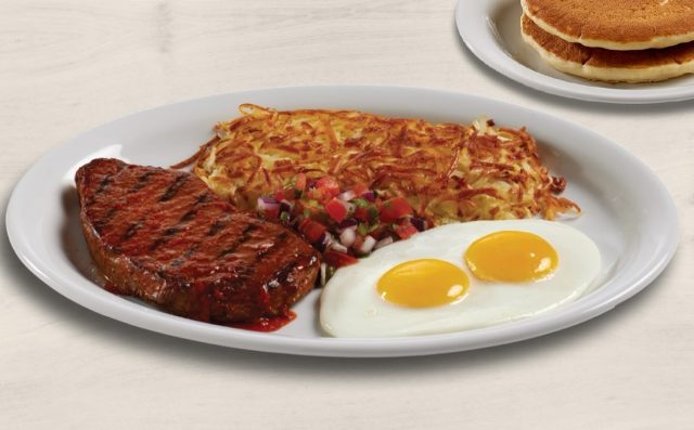 Denny’s has a T-Bone Steak & Eggs plate for $19.99 (depending on your choice of sides). This platter contains a 13 oz. seasoned T-Bone steak, served with two eggs, hash browns and choice of bread. Those who want a lighter option can opt for the Sirloin Steak & Eggs ($14.59), which is one 8 oz. seasoned sirloin steak served with two eggs, hash browns, and white toast.