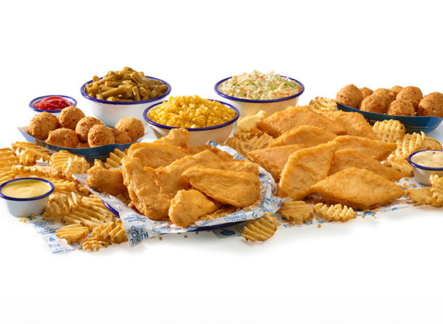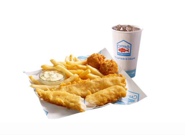 Captain D’s batter-dipped fillets and hushpuppy sides are on the menu all year long. The 2 Piece Fish & Fries Combo comes with two Batter Dipped Fish fillets served with your choice of one classic side and a refreshing beverage. You can also order the Capt’n D’s Crispy Butterfly Shrimp. “A plentiful portion of our butterfly shrimp served with your choice of two sides and hush puppies,” the menu says.