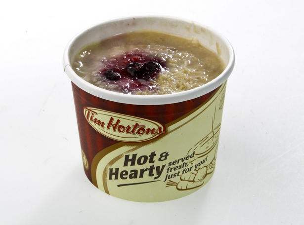 Tim Horton’s Homestyle Oatmeal is a maple-flavored oatmeal with 20 grams of sugar, most of which is added sugar. With no fruit or nuts to add extra fiber, healthy fats, or protein, each serving has just 5 grams of protein and 4 grams of fiber.