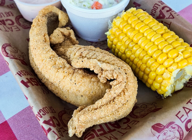 Eat My Catfish has a variety of catfish meals on the menu, but going back to basics, customers can get a simple catfish dinner consisting of crispy catfish fillets and 2 regular sides, in addition to some hushpuppies and “Mawmaw’s tartar sauce.” On the side, their BBQ baked beans and cajun rice pair well with the fried catfish meals.