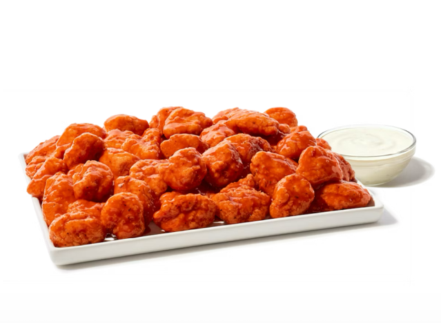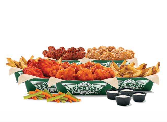 Wingstop Party Wing Packs come in various sizes to feed a crowd, including 50 and 100 wing options. The 50 Piece Party Pack comes with 50 Boneless or Classic (Bone-In) wings with up to 4 flavors, 2 large fries, veggie sticks, and 4 dips. They are also available in 30 and 75-wing options. The only question is, what flavors should you choose? “2 words: Lemon. Pepper,” writes one Redditor. “Don’t forget Original Hot,” another says. “Wingstop, no contest. Reasonable selection of sauces for any pallet, decent sized wings with bone-in and boneless options. Their fries are like none of the competitors. Their ranch tastes fresh and isn’t repackaged store-bought Hidden Valley, unlike what BWW and other contenders on the list tastes like. Same goes for their bleu cheese. Another rare quality: consistently good wings,” a third argues.