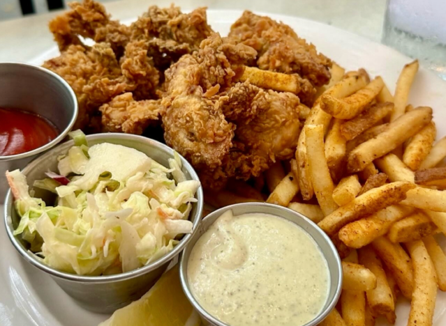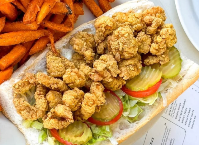 Hank’s Oyster Bar has delicious Fried Oysters served with French fries, plus a delicious Fried Oyster Po’boy. Guests can also enjoy fried oysters as part of the Ultimate Fry Plate. “Come try our award winning raw bar options like the fully loaded Seafood Plateau or tuck into some fan favorite like our Maine style lobster roll, fried oyster po’boy, crab cake platter, and molasses braised short ribs. AND…don’t forget the oysters including the Salty Wolfe: our proprietary oyster grown in the lower Chesapeake Bay!” the chain says. “The fried oyster dinner was delicious, and I loved the seasonal maple old-fashioned,” one diner said.