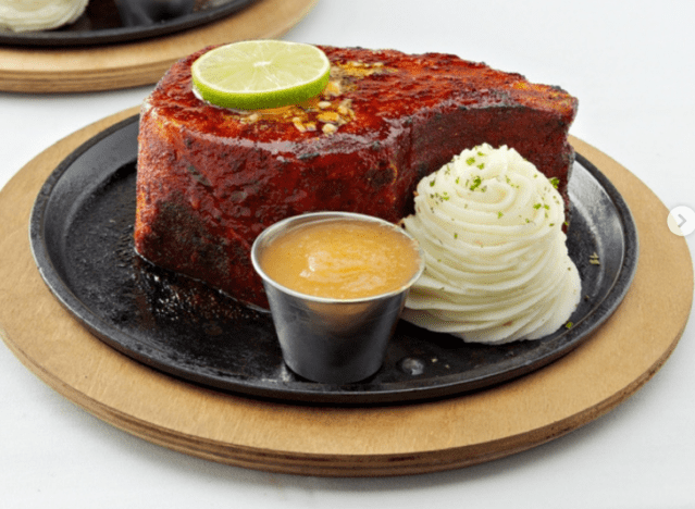 Luby’s Jumbo Pork Chop is a fried and breaded option diners love for its size and value. “Porterhouse Pork Chop, 2 sides, and a roll…$15.99. The pork chop is huge! It is delicious!” one diner shared via Facebook, sharing a picture of their meal (it really does look gigantic).